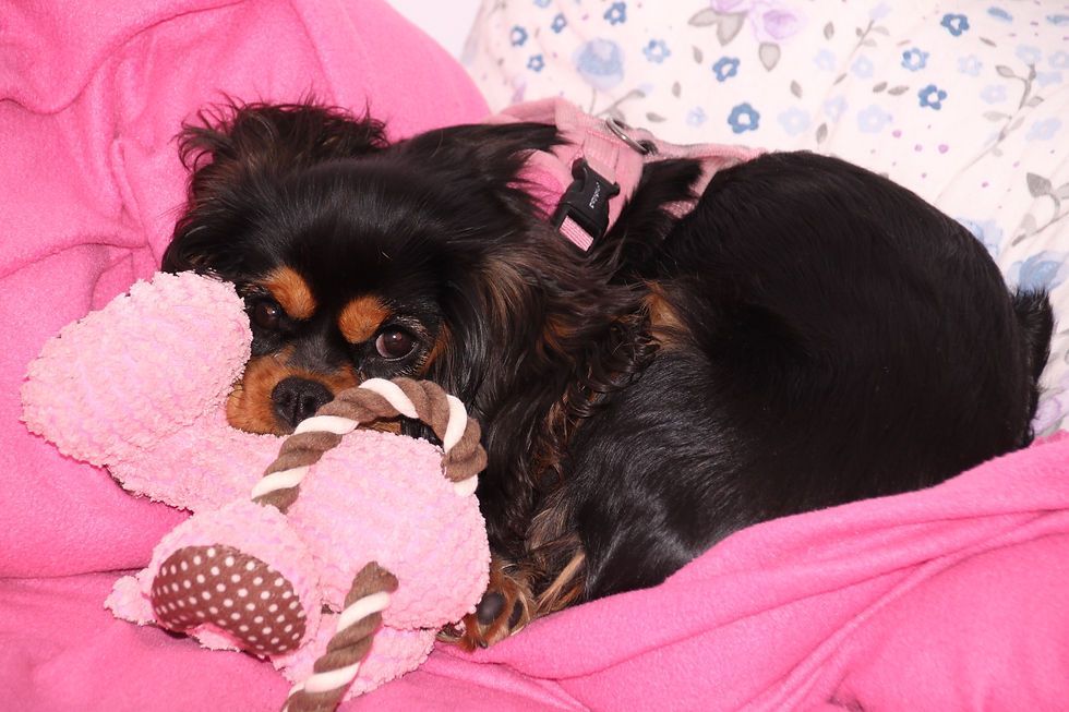 Her har hun fått en ny leke som vi kalte Pinky, og den ble fort yndlingskoseleke.